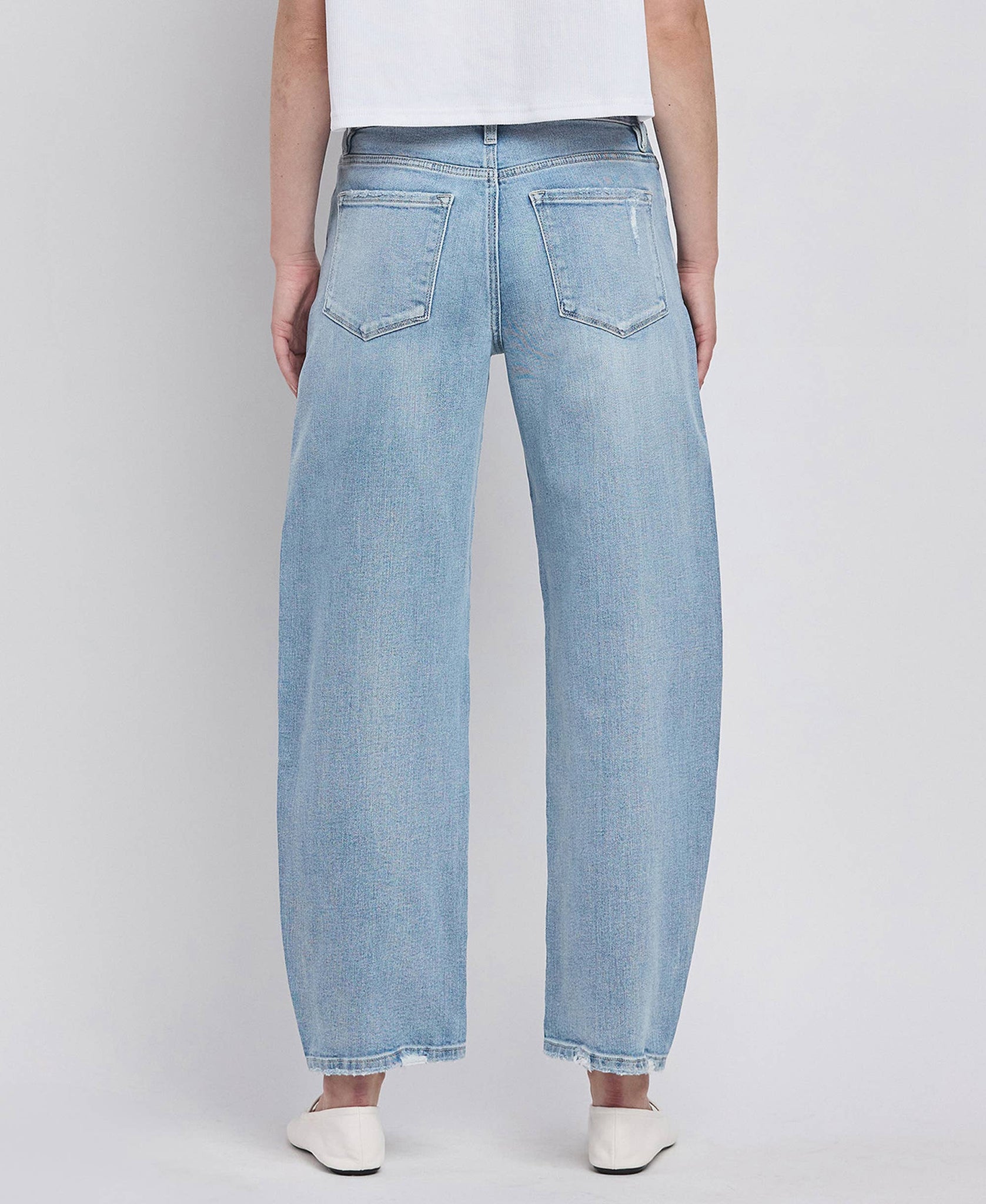 HIGH RISE BARREL LEG JEANS COMFORT STRETCH DENIM, HIGH RISE WAIST, SLIGHTLY DISTRESSED DETAIL, ANKLE LENGTH, BARREL LEG JEANS
